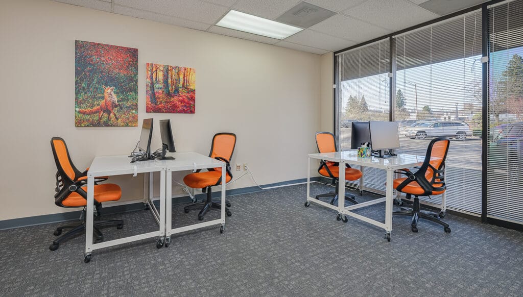Our hot desk area is quiet, clean, and calm. Our dedicated desks and conference room have a view of the Clackamas River. Whether you need to write, build, code, design, or plan, we’ve designed the space to help you focus.